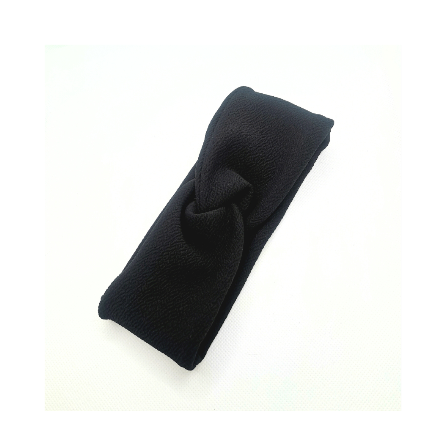 Vincha ancha con divertido diseño de semi nudo superior, elaborado en tela berna de color negro, con soporte cómodo.